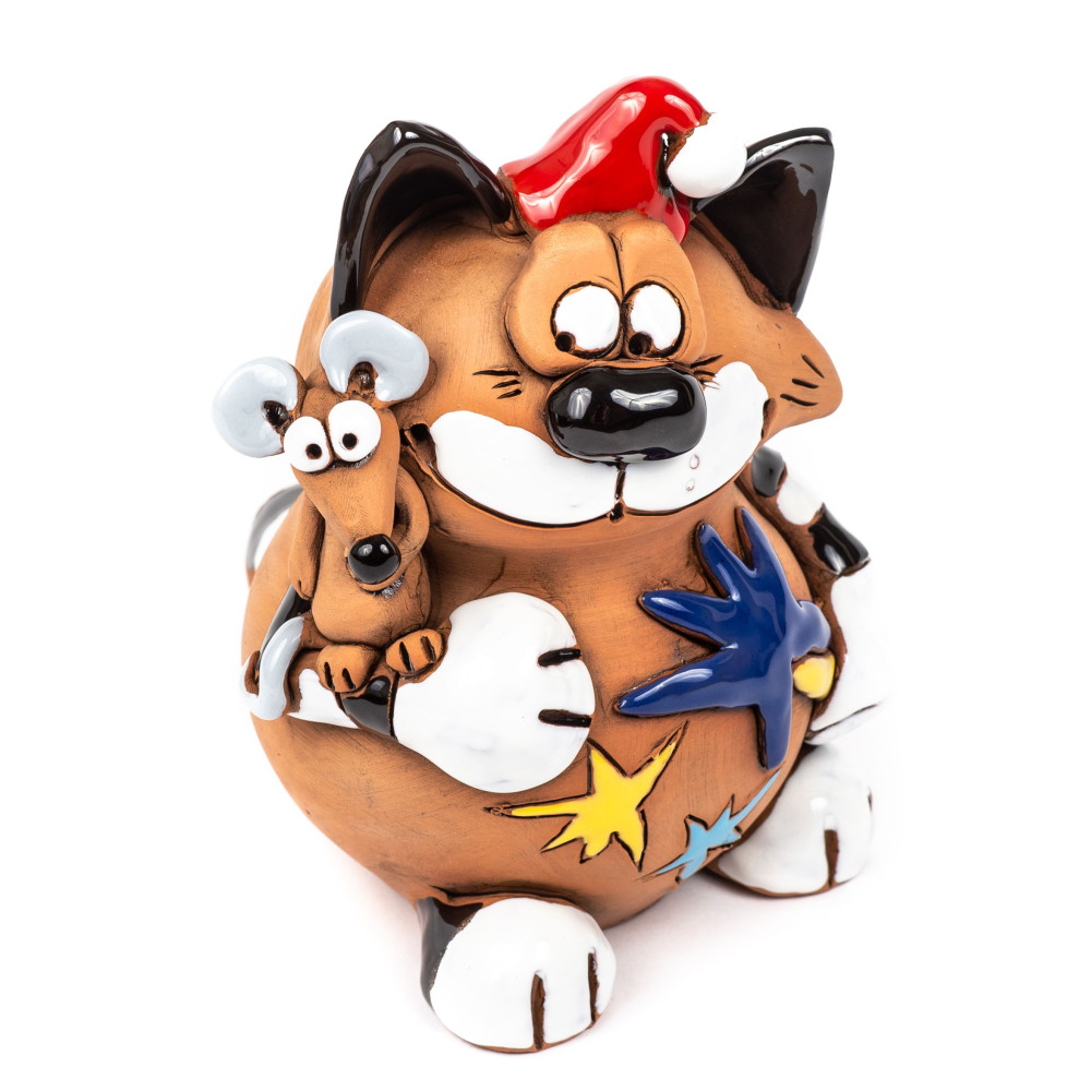 Mūsų Kalėdų katė su pele, pagaminta iš keramikos, yra labai daug dėmesio į rankų darbo detales, visiškai rankas ir tikras unikalus gabalas. Tuo pačiu metu tobula Kalėdų apdaila ir, žinoma, kaip Kalėdos yra tikras akcentas.