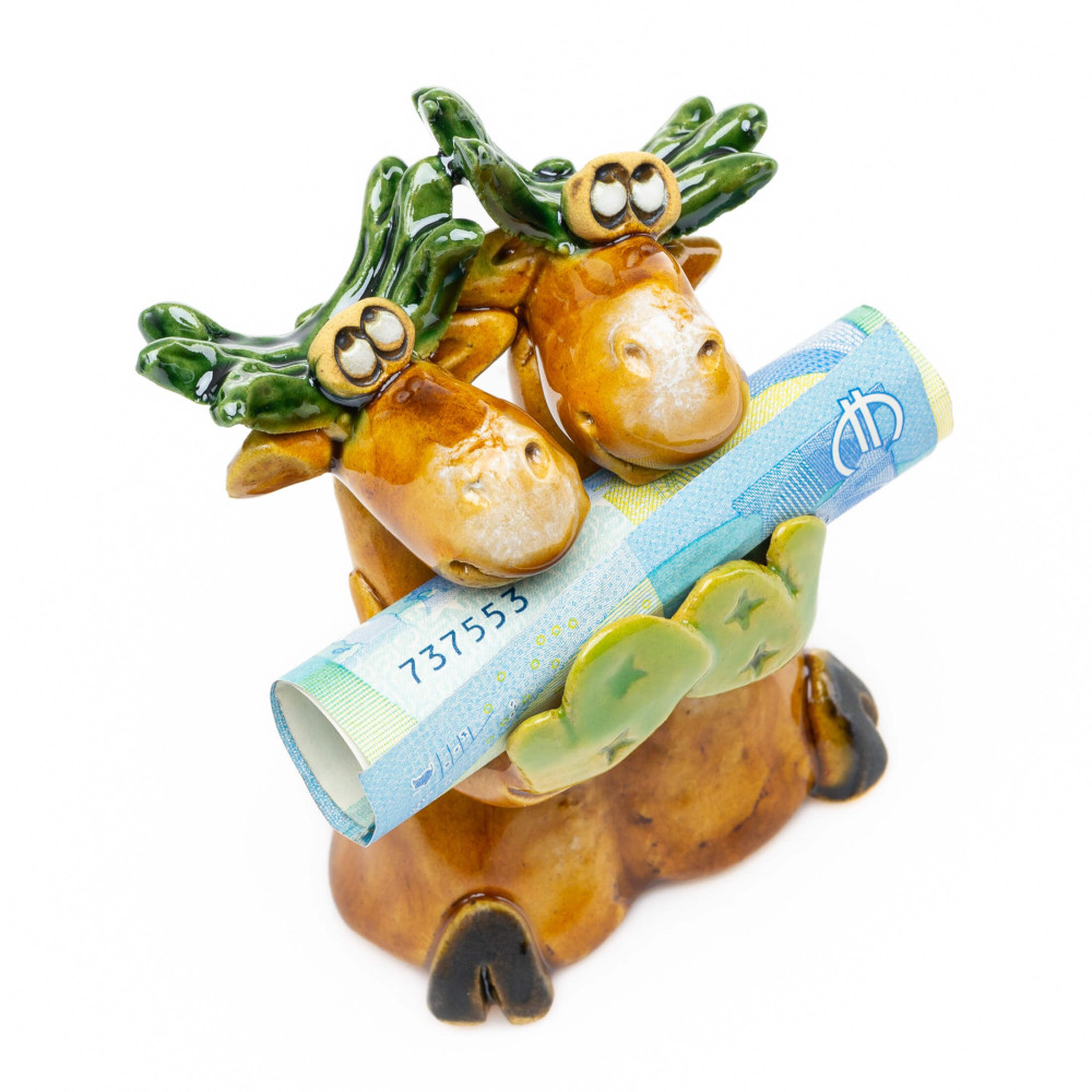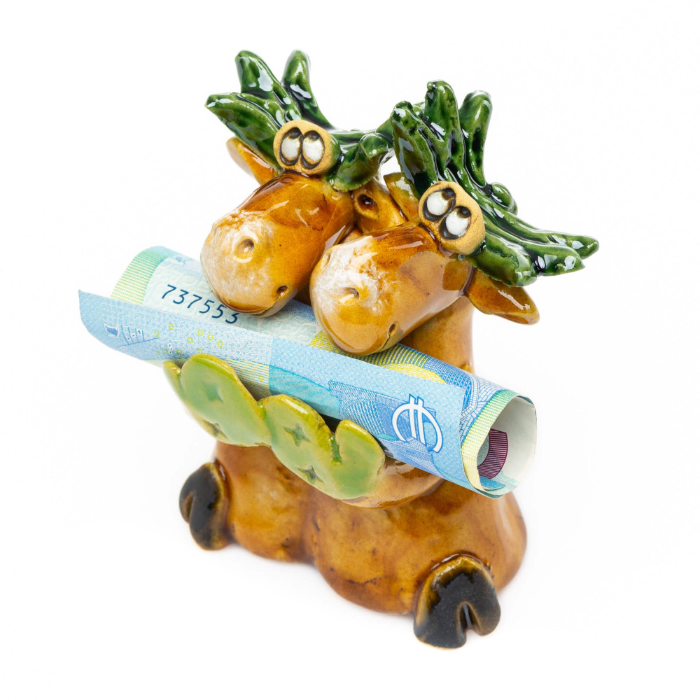 Dviejų briedžių priekinės kojos suteikia pakankamai vietos, todėl galite laikyti valcuotinas sąskaitas. Kaip rezultatas, šis skaičius yra puikus papildymas pinigų dovanos skirtingoms progoms. Žinoma, šis skaičius taip pat yra deekofigur ant baldų gabalų arba palangės tikro akcento.