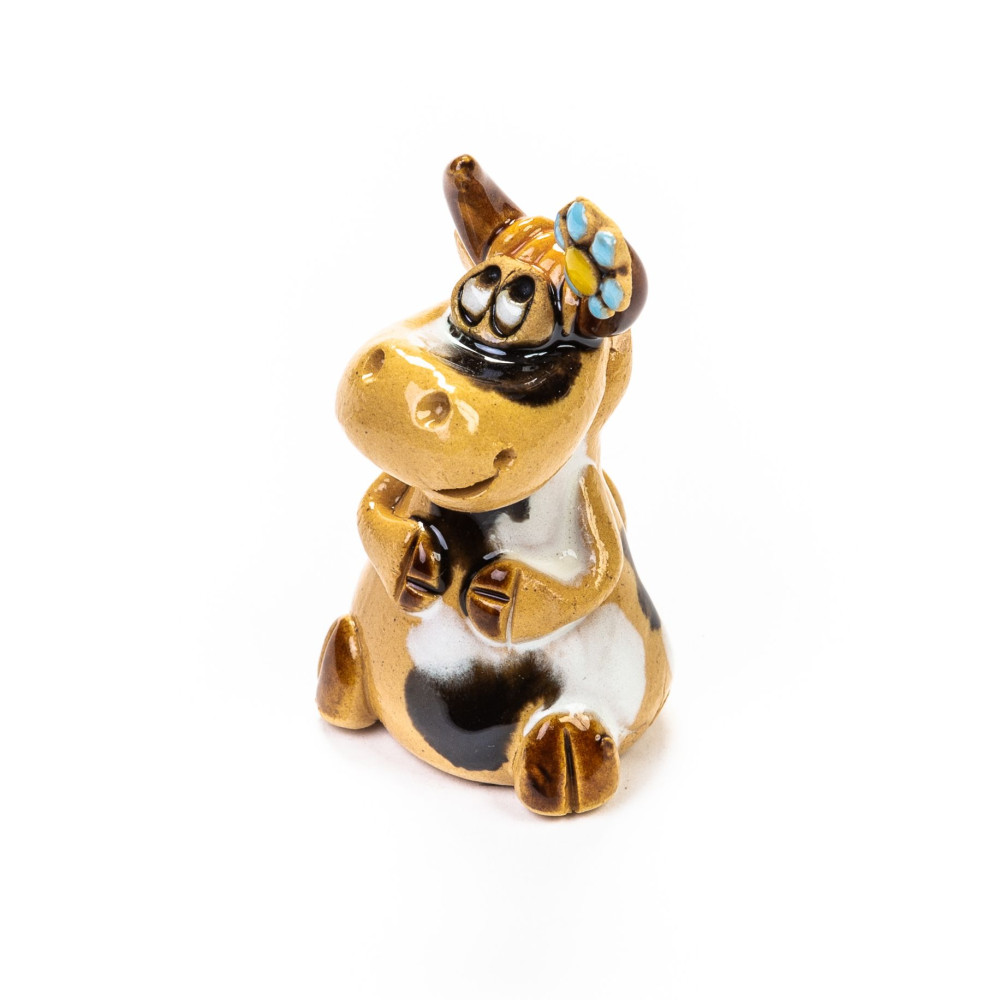 Posėdžių karvės figūra, pagaminta iš keramikos, yra atkreiptas dėmesys detalėms. Jos draugiškas veidas ir bloga daro šį paveikslą visur akcentu ir puikiai papildo mylinčią apdailą namuose.