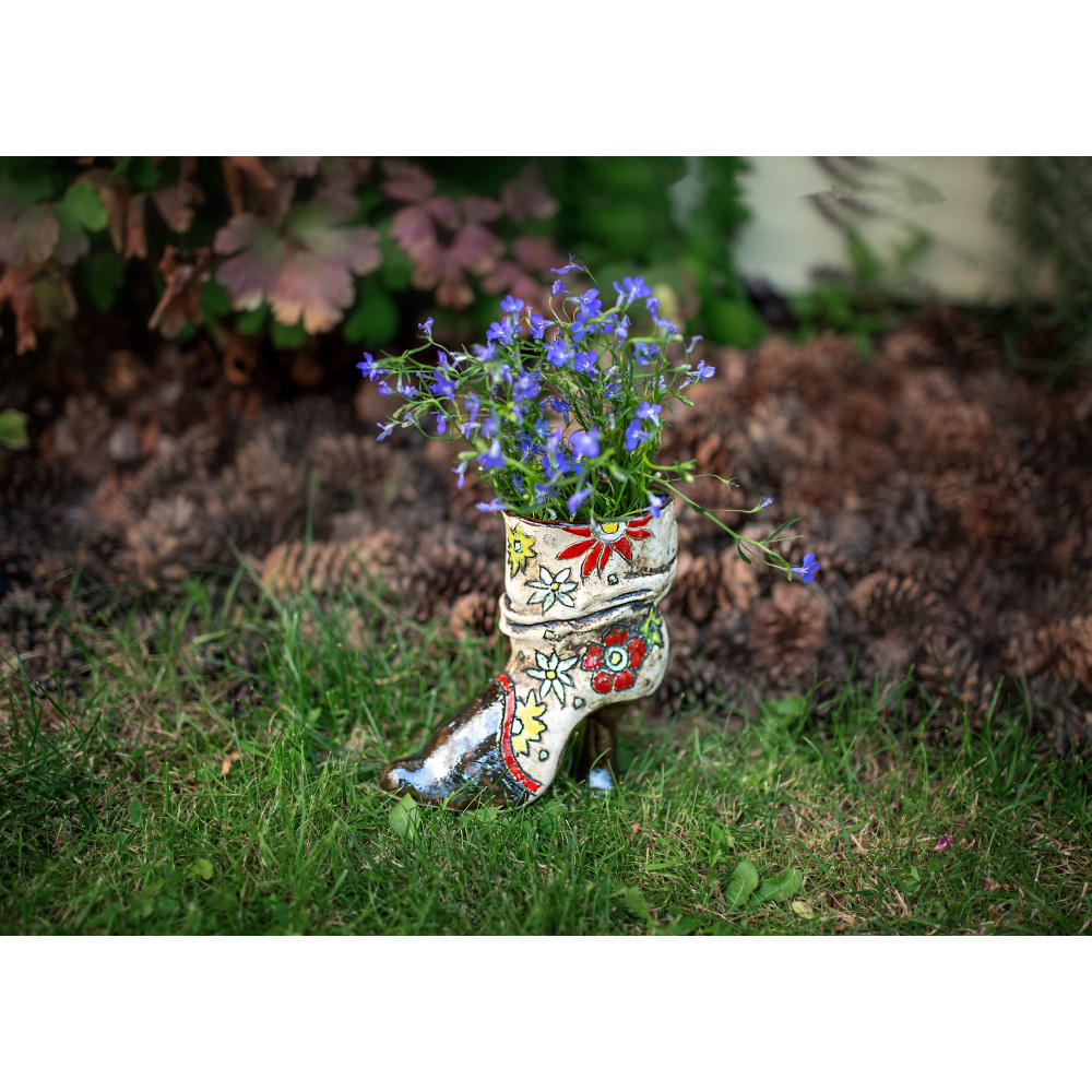 Visi papuošti savo namus, sodą ir terasą su gėlėmis; Bet kaip apie savo namus ir sodą ne tik dekoruoti gėlėmis, bet ir su gėliųpotais? Šis keraminis gėlių vazonas suteikia jūsų namams ir sodo unikalumą, spalvą ir gerą nuotaiką. Puikiai taip pat yra dovana sodui, dekost draugams ir batų mėgėjams.