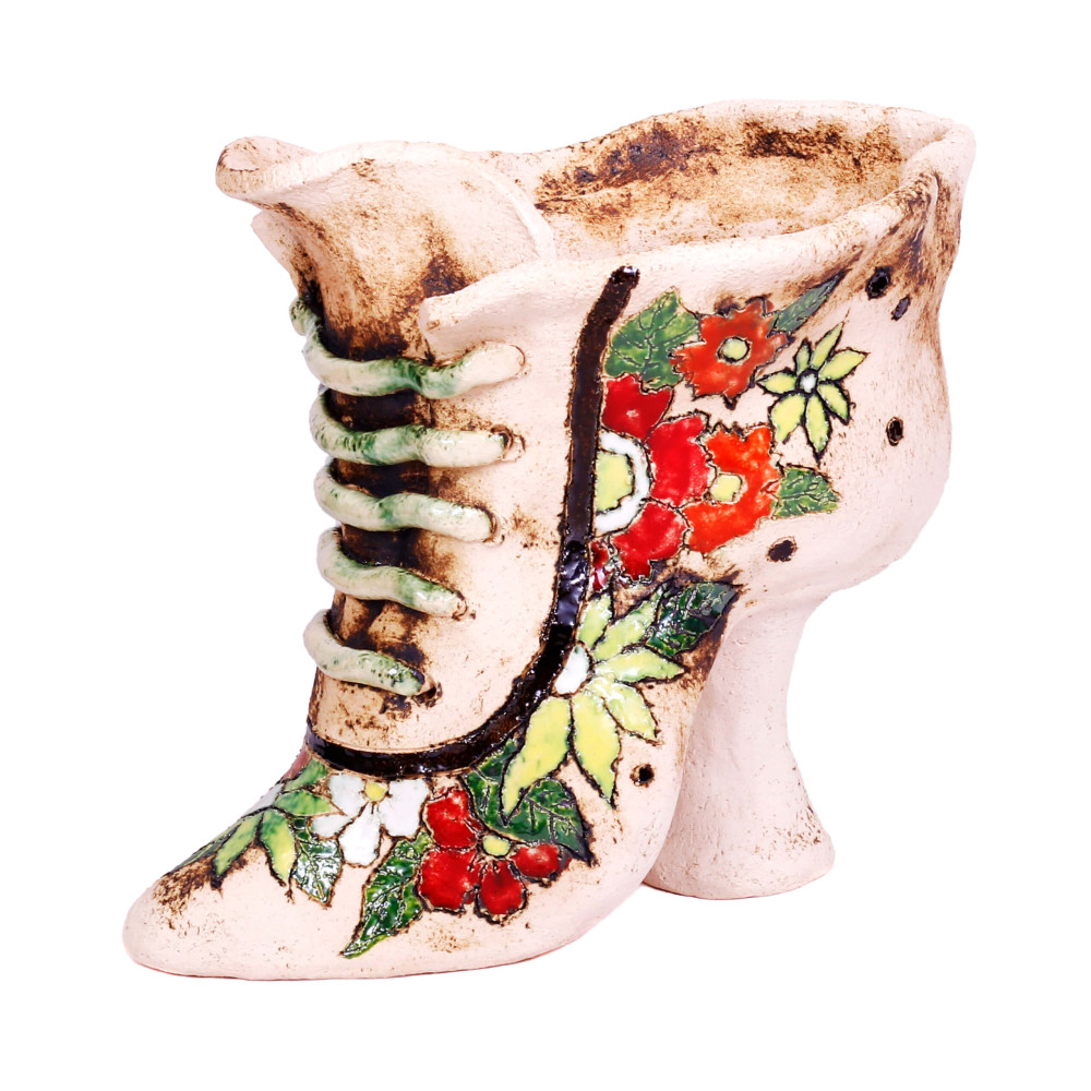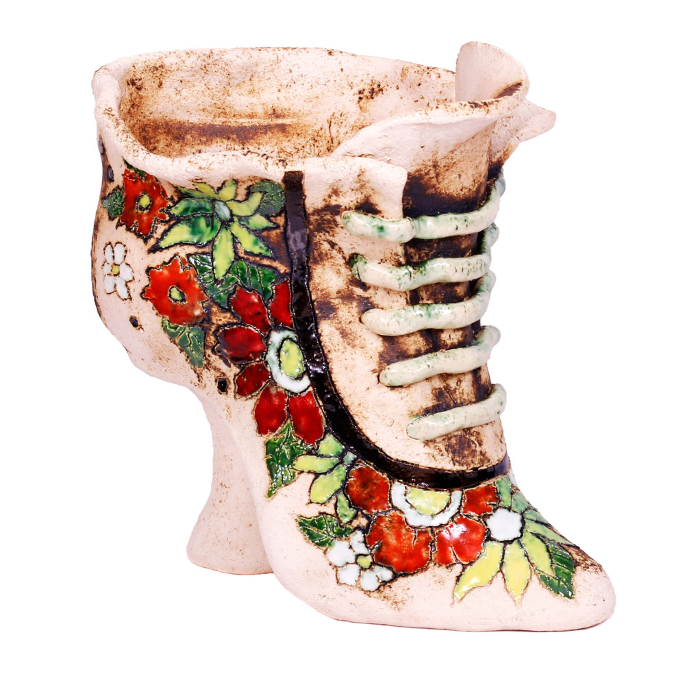 Visi papuošti savo namus, sodą ir terasą su gėlėmis; Bet kaip apie savo namus ir sodą ne tik dekoruoti gėlėmis, bet ir su gėliųpotais? Šis keraminis gėlių vazonas suteikia jūsų namams ir sodo unikalumą, spalvą ir gerą nuotaiką. Puikiai taip pat yra dovana sodui, dekost draugams ir batų mėgėjams.