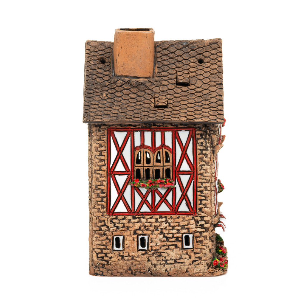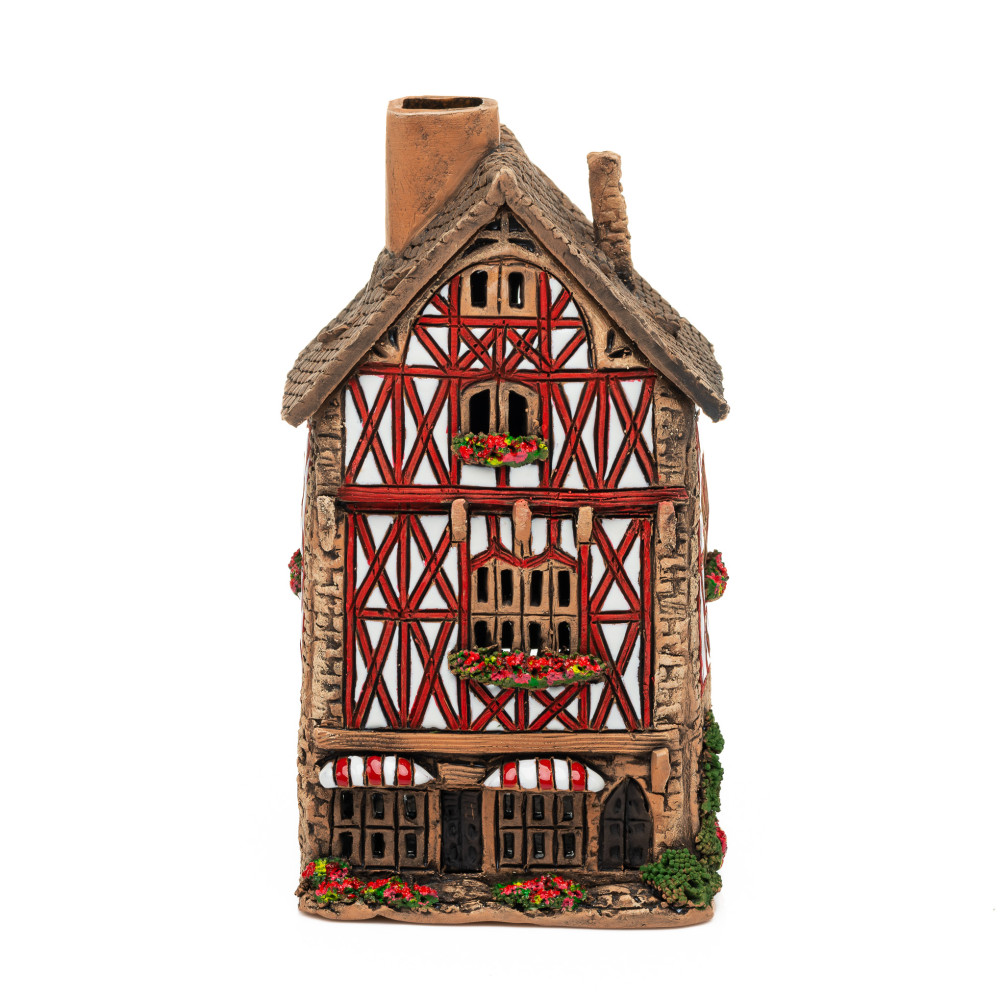 Rankų darbo ir rankų dažytos keraminės pusiau medienos namas su raudonais pusiau mediena yra tikras kiekvieno apdailos akcentas. Ar kaip Kalėdų denio ant stalo ar palangės arba kaip akcentas miniatiūrinėje kraštovaizdyje; Keraminis namas yra visuotinai taikomas ir viename pasaulyje ir kvepalų lempa.