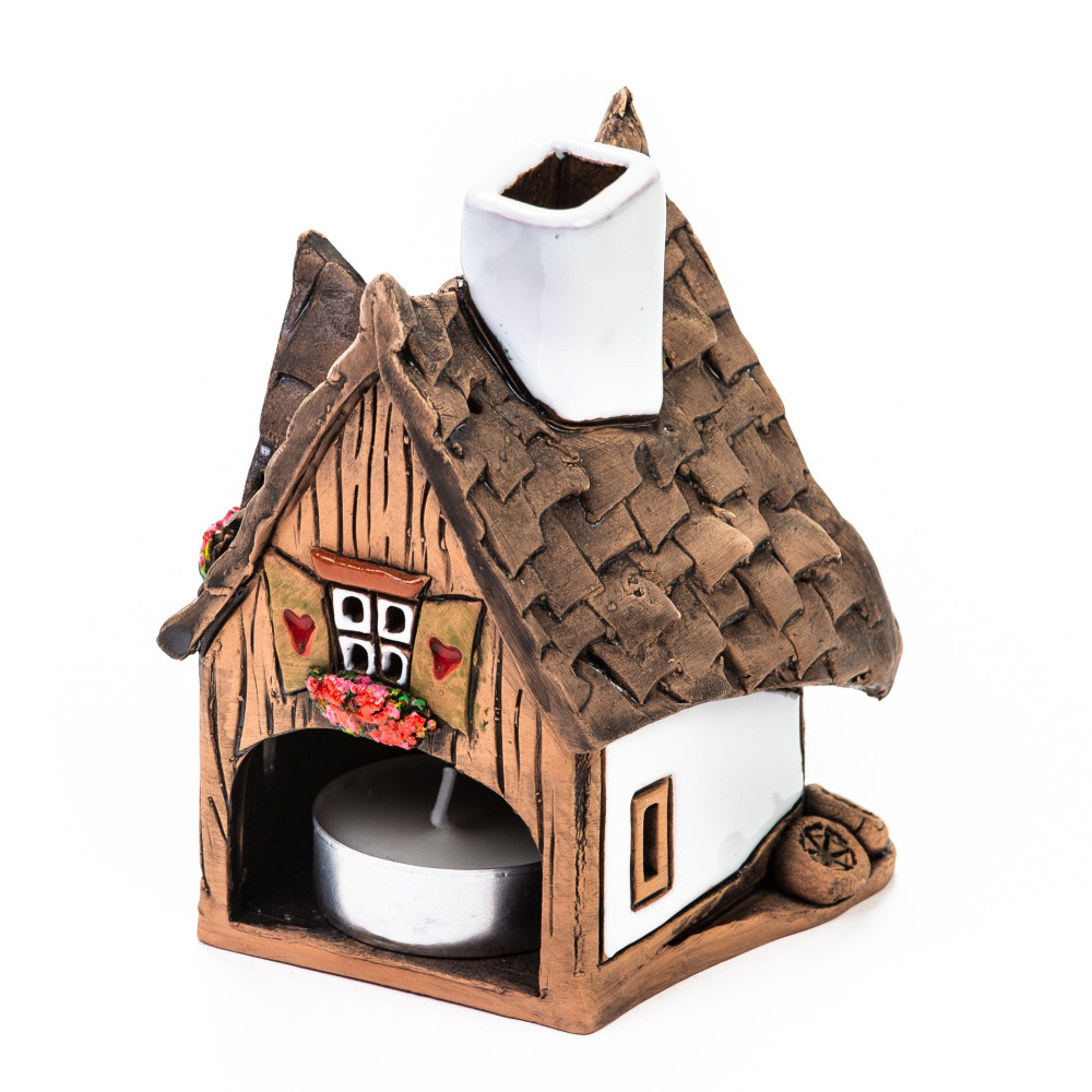 Sie können in den Schornstein des Hauses Duftöl einfüllen. Mit einem Teelicht im Inneren wird das Öl erhitzt und verdampft. Außerdem bietet das Haus innen Platz für Duftkerzen, Räucherkegel oder Räucherkerzen.