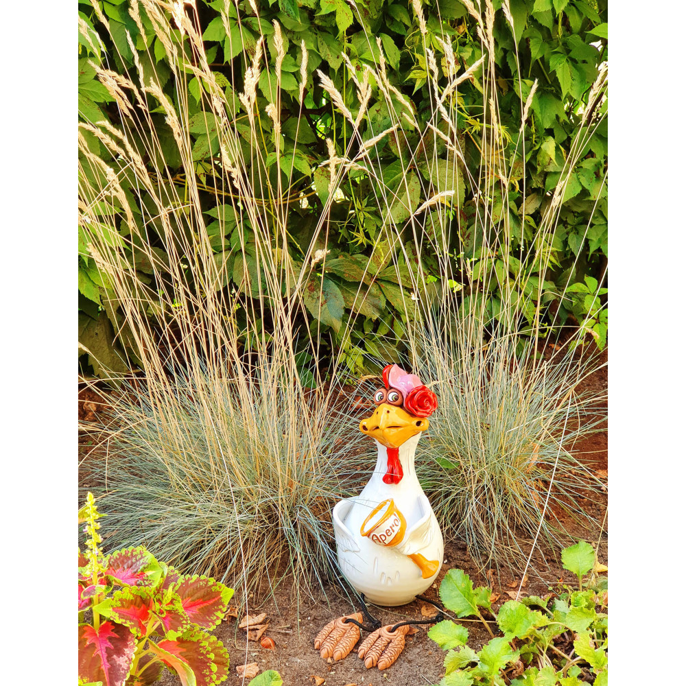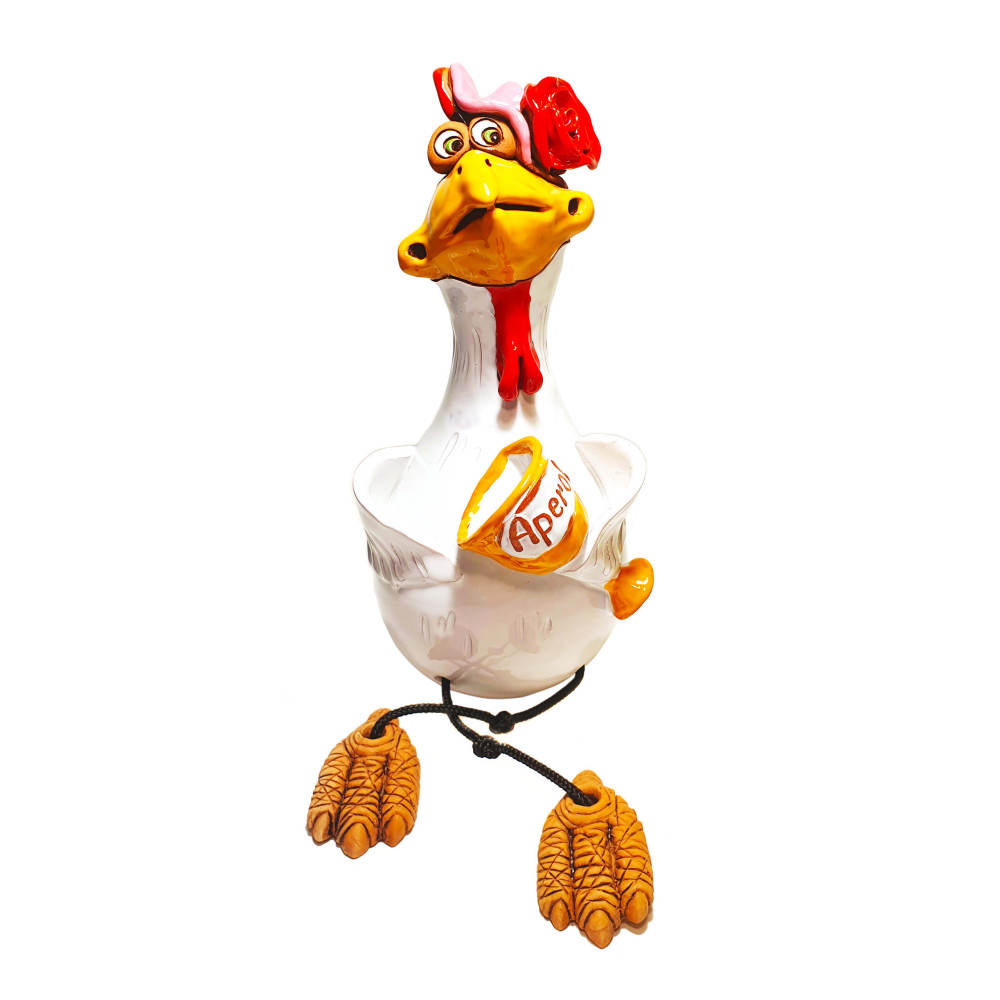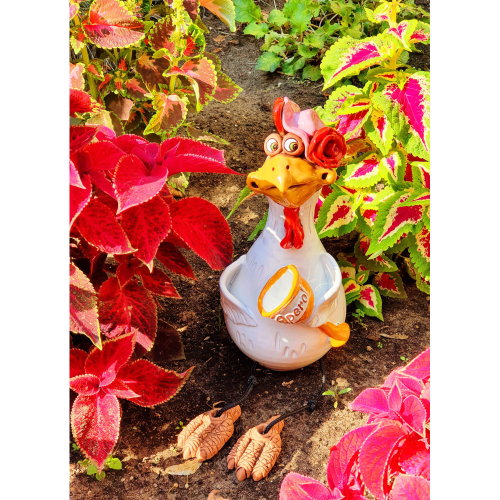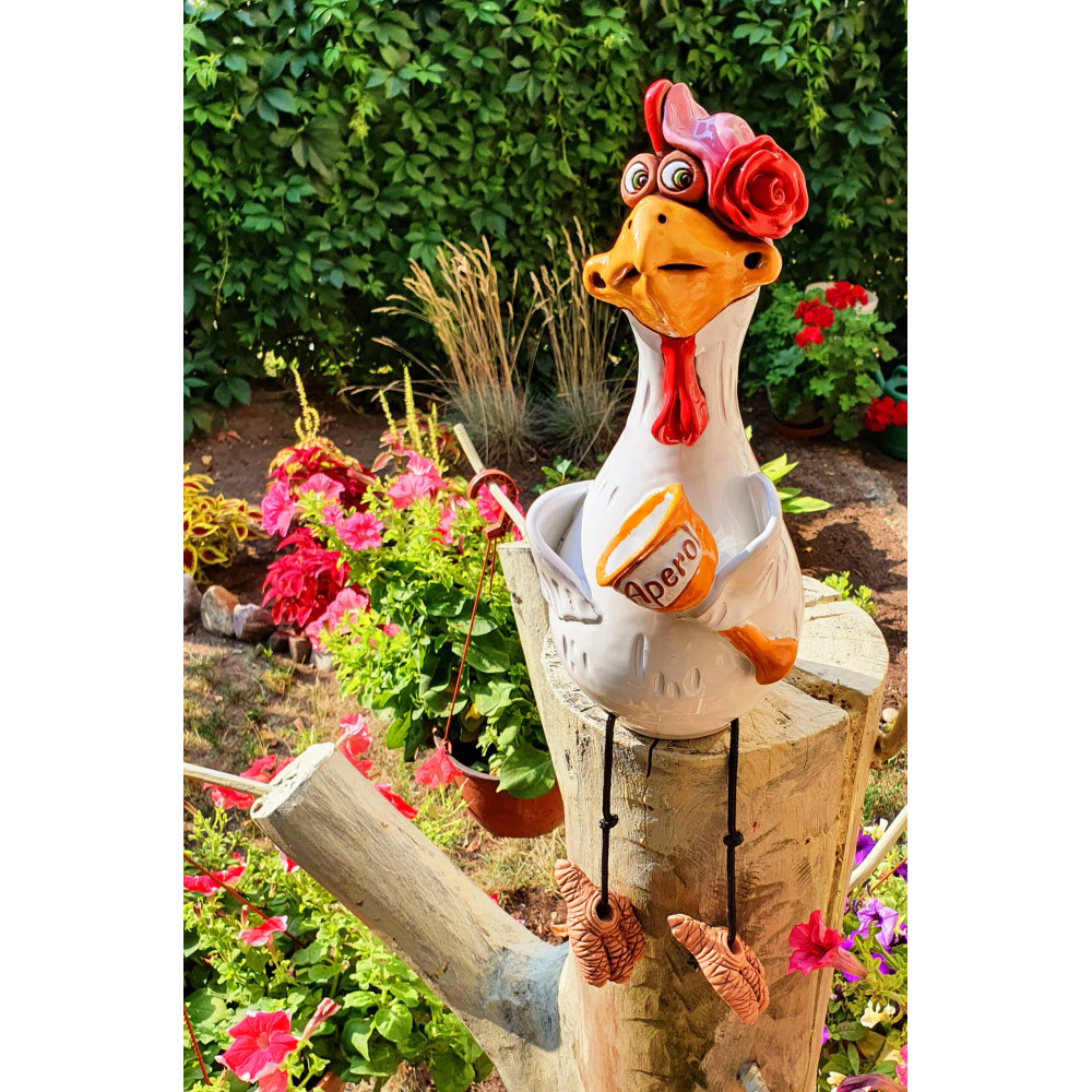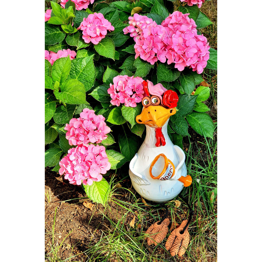 Juokingi vištiena, pagaminti iš keramikos, pakabina kojas. Kaip rezultatas, sodo jungtis figūra taip pat tinka kaip krašto kėdė ir decrofigur ant palangės ar jo baldų. Per apačią ant apačios, rankų darbo figūra gali būti lengvai konvertuojama į sodo kištuką. Žinoma, sodo deco paukštis yra akcentas kaip Velykų deceksas. Šis skaičius yra visiškai rankomis ir rankiniu būdu.