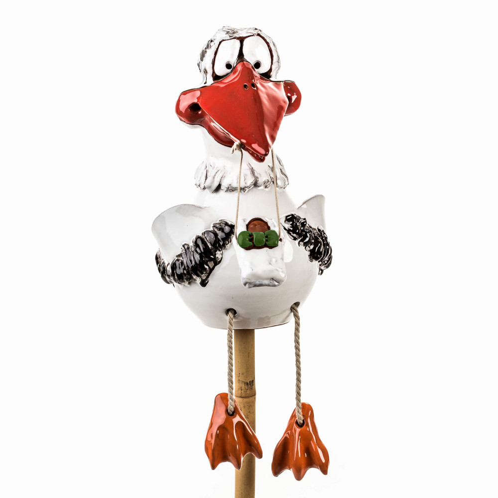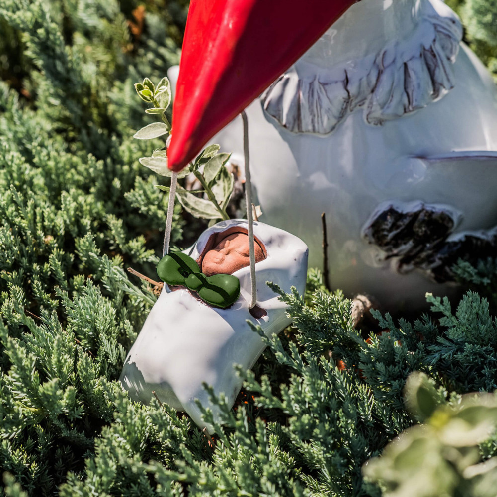 Gandras figūra yra ne tik idealiai tinka kaip dovana šviežiai keptiems tėvams arba kaip tėvų sode apdaila, bet taip pat yra tikras, kaip sodo apdailos figūra. Per apačią ant apačios, galite naudoti figūrą su metaliniu ar medžio strypu kaip sodo kištuku; Per kabančias kojas, tai taip pat puikiai kaip krašto išmatos.