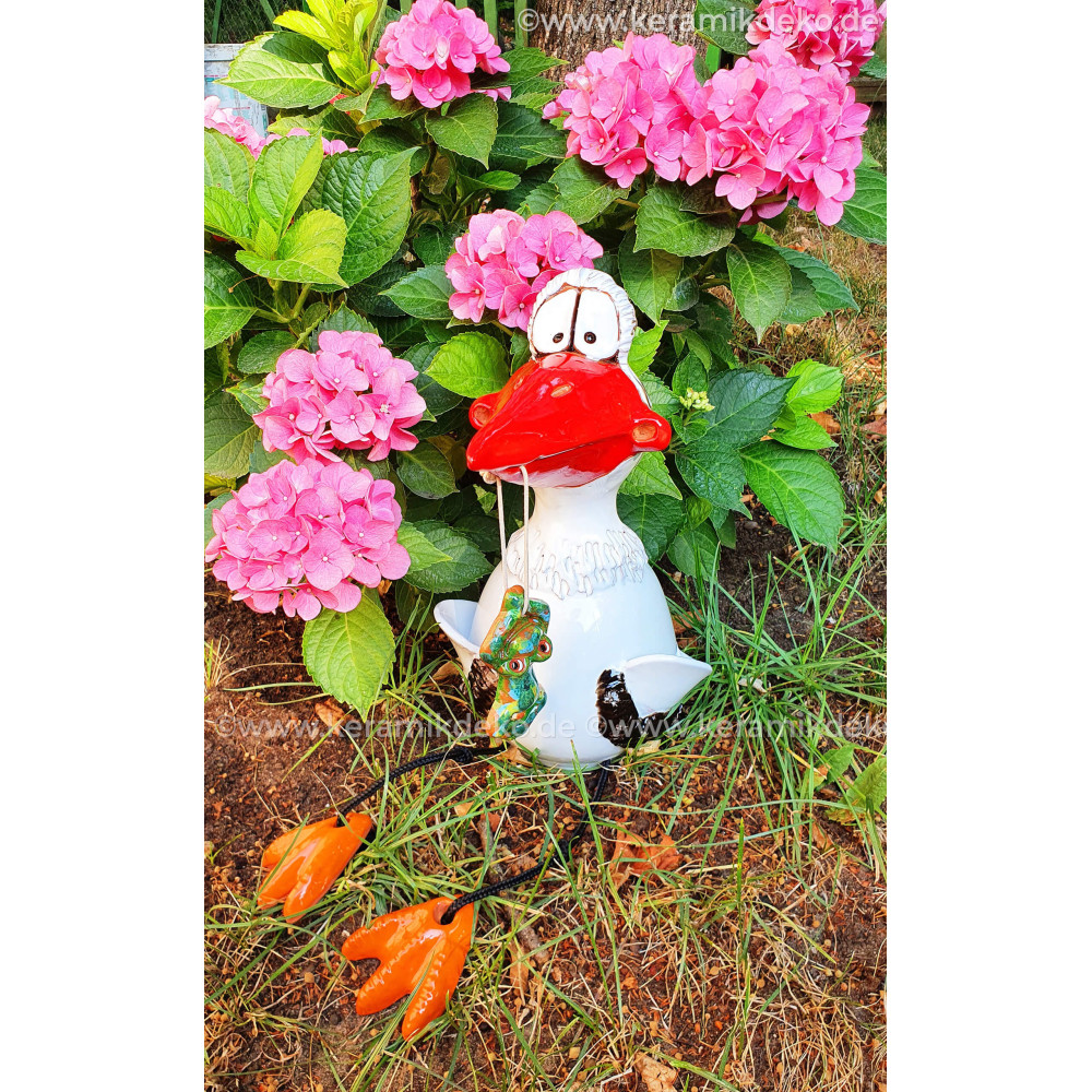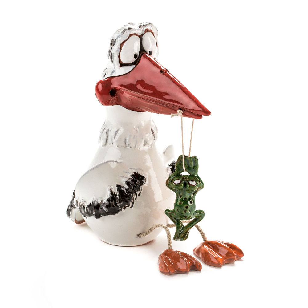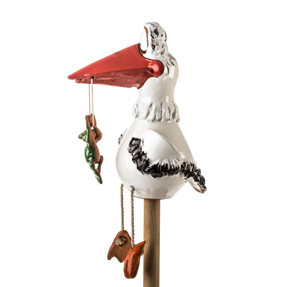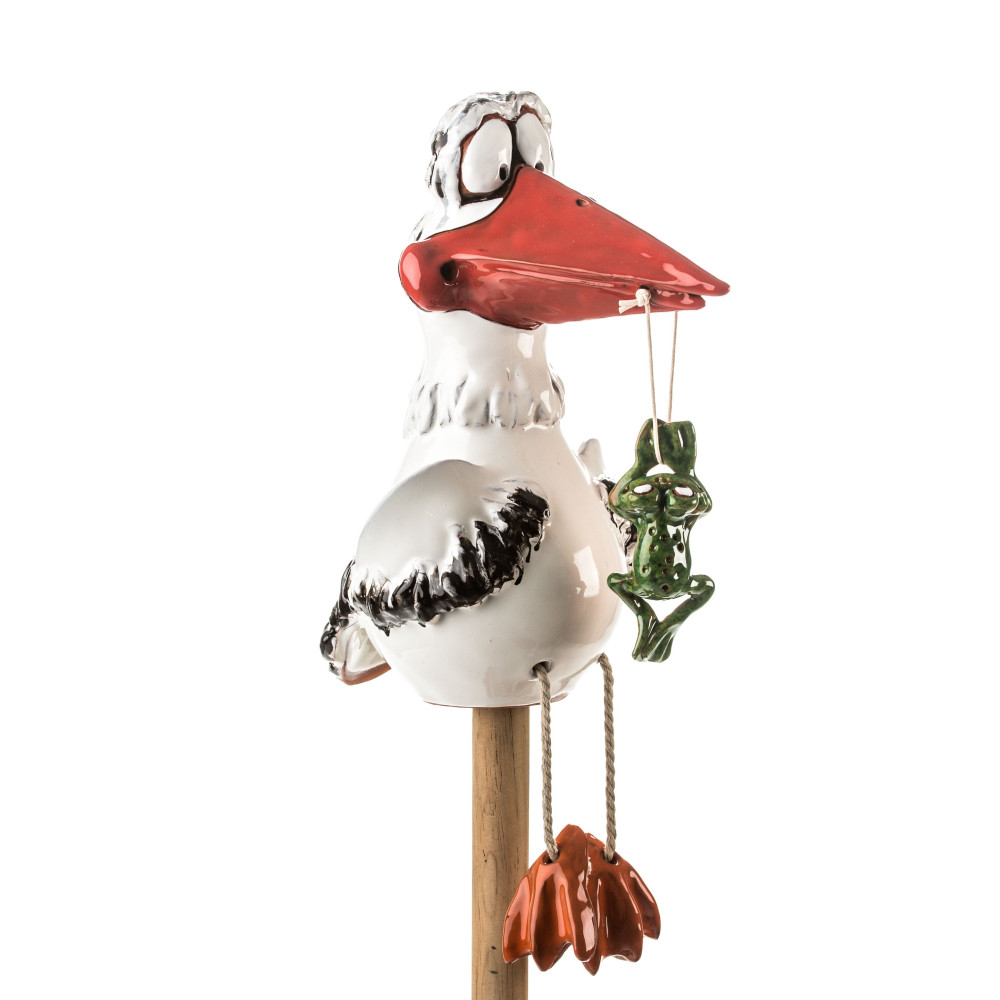 Jūs neturėtumėte sustabdyti keraminių nuolatinių atmosferos ar aukšto temperatūros svyravimų. Kadangi gaminame gandrą rankoje, jis gali ateiti į mažus nuokrypius dydžio, formos ar spalvos. Strypas naudoti paukščio charakterį kaip sodo kištuką arba gėlių kištuką dar nėra įtrauktas.
