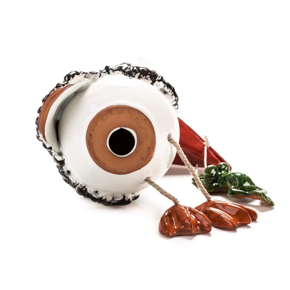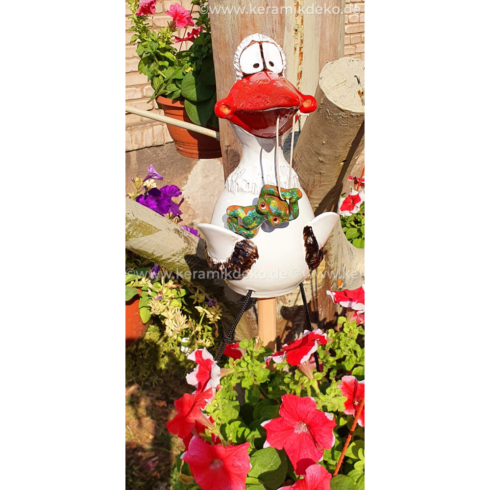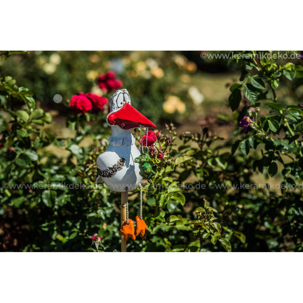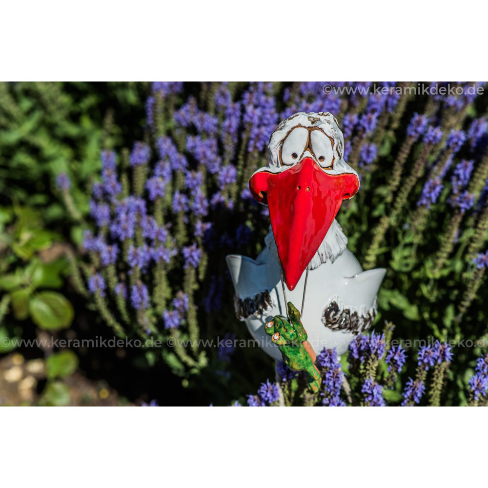 Jūs neturėtumėte sustabdyti keraminių nuolatinių atmosferos ar aukšto temperatūros svyravimų. Kadangi gaminame gandrą rankoje, jis gali ateiti į mažus nuokrypius dydžio, formos ar spalvos. Strypas naudoti paukščio charakterį kaip sodo kištuką arba gėlių kištuką dar nėra įtrauktas.
