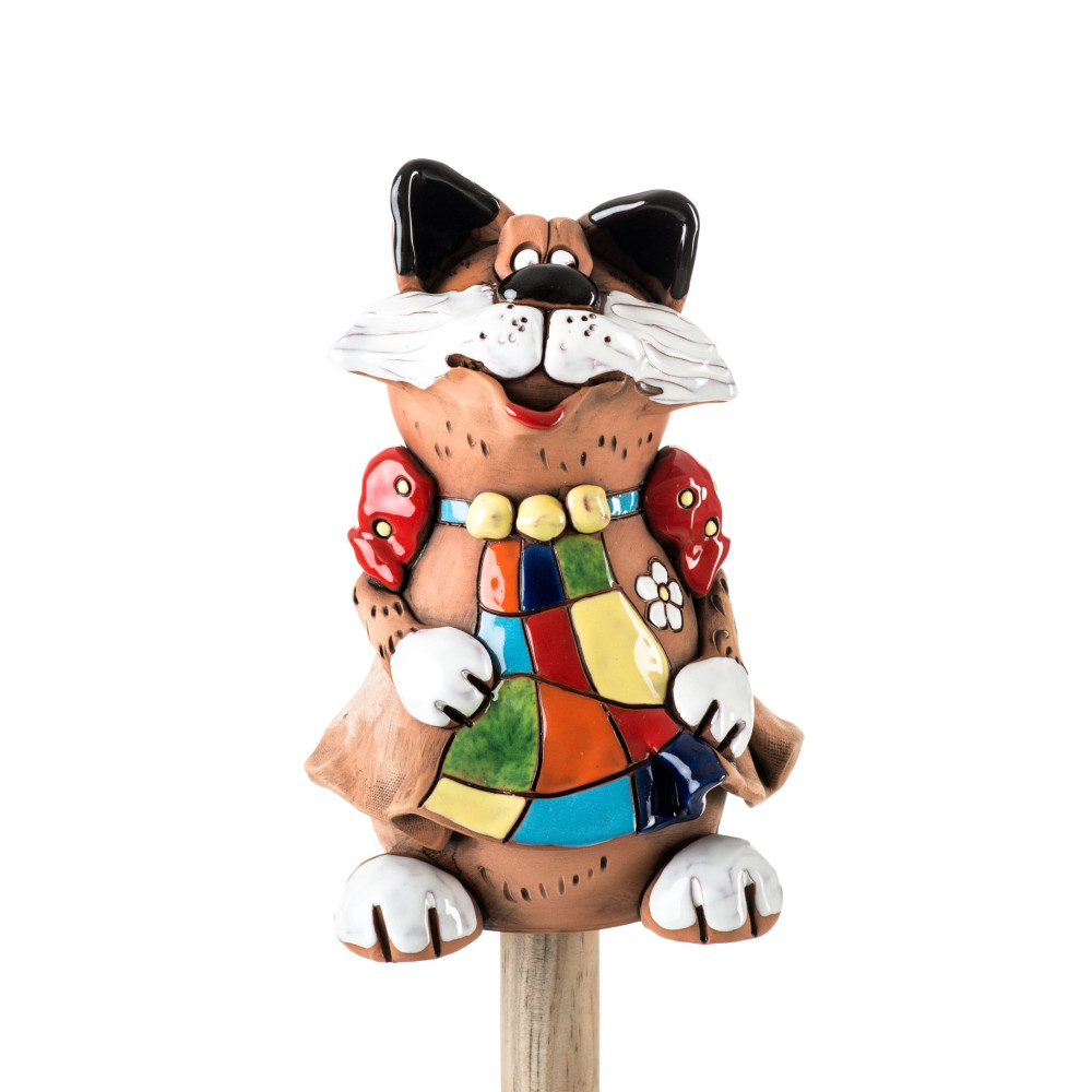 Spalvinga keraminė katė yra su dideliu dėmesiu detalėms rankų darbo vietoje ir, žinoma, rankiniu būdu. Per suknelę ji gerai veikia ir yra tikras praturtinimas kiekvienam sodui ir terasa. Jis gali būti naudojamas kaip sodo kištukas arba tiesiog kaip juokingas decofigur namuose ir, žinoma, daro save puikiai kaip kūrybinė dovana katės savininkams.