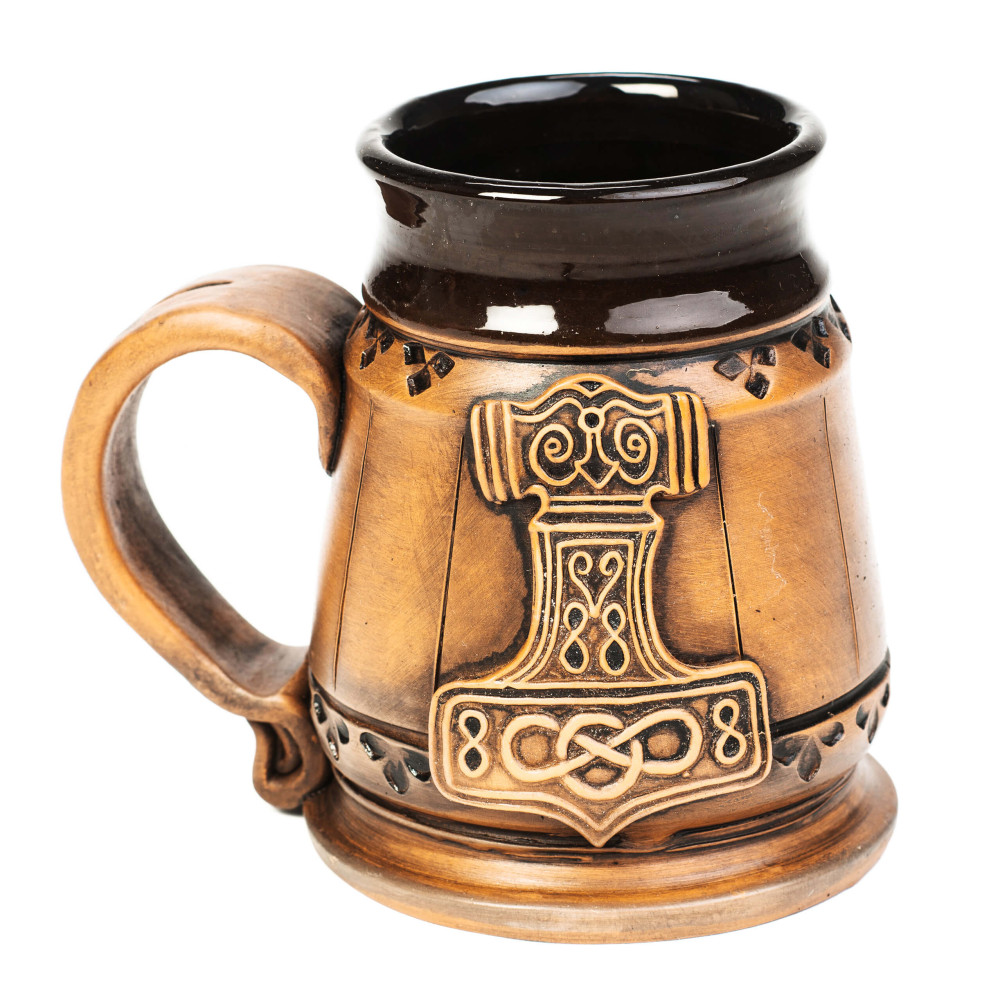 Mūsų vikingų puodelis yra pagamintas su didele meile daliai ir, žinoma, nudažyti visiškai ranka. Ne tik "Nordic Mitology" gerbėjams yra ąsotis su thors plaktuku tikruoju akcentu. Plaktukas yra lengvai plastikas, ir talpa yra 0,5 litrų.