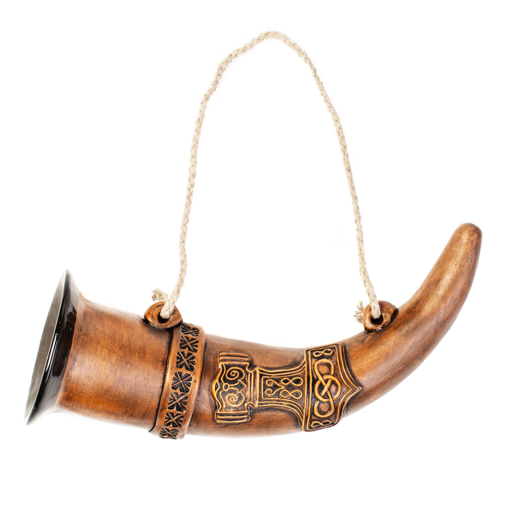 Rankų darbo keramikos gėrimo ragas yra su dirželiu ir visiškai nudažytas. Vikingo motyvas yra lengvai plastikas, išskleidžiama ir padarykite Trinkhorną visiems Šiaurės mitologijos gerbėjams. Žinoma, tai taip pat yra labai gera, kaip ir Met-Trinkhorn viduramžių rinkose puikiai tinka.